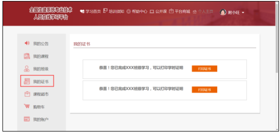 待课程学习完毕后,方可打印继续教育培训证书。单门课程不支持打印证书。专题课程需学习完专题下所有课程方可打印证书。班级证书需学习完班级下所有课程方可打印证书。